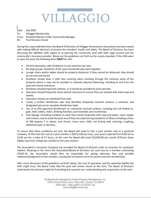 Home / Manager's Messages / Pool Remains Closed Pool Remains Closed Posted By echarlot on July 2, 2020